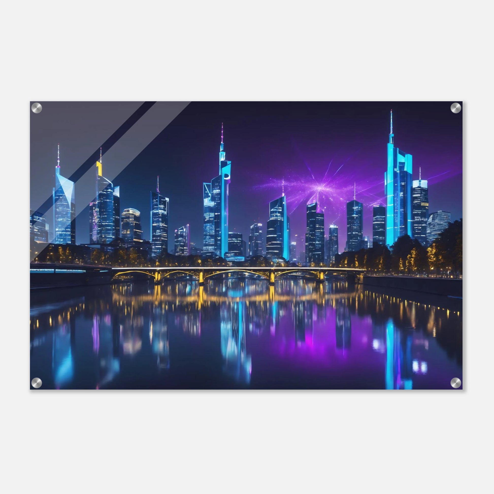 Holen Sie sich das pulsierende Flair der Main-Metropole nach Hause. Dieses hochwertige Motiv zeigt die beeindruckende Frankfurter Skyline bei Nacht, gespiegelt im ruhigen Wasser des Mains. Die markanten Wolkenkratzer werden durch ein spektakuläres violettes Feuerwerk am Nachthimmel und moderne blaue LED-Beleuchtungen perfekt in Szene gesetzt. Eine elegante Wanddekoration für alle Fans von Architektur, Stadtansichten und urbanem Lifestyle.